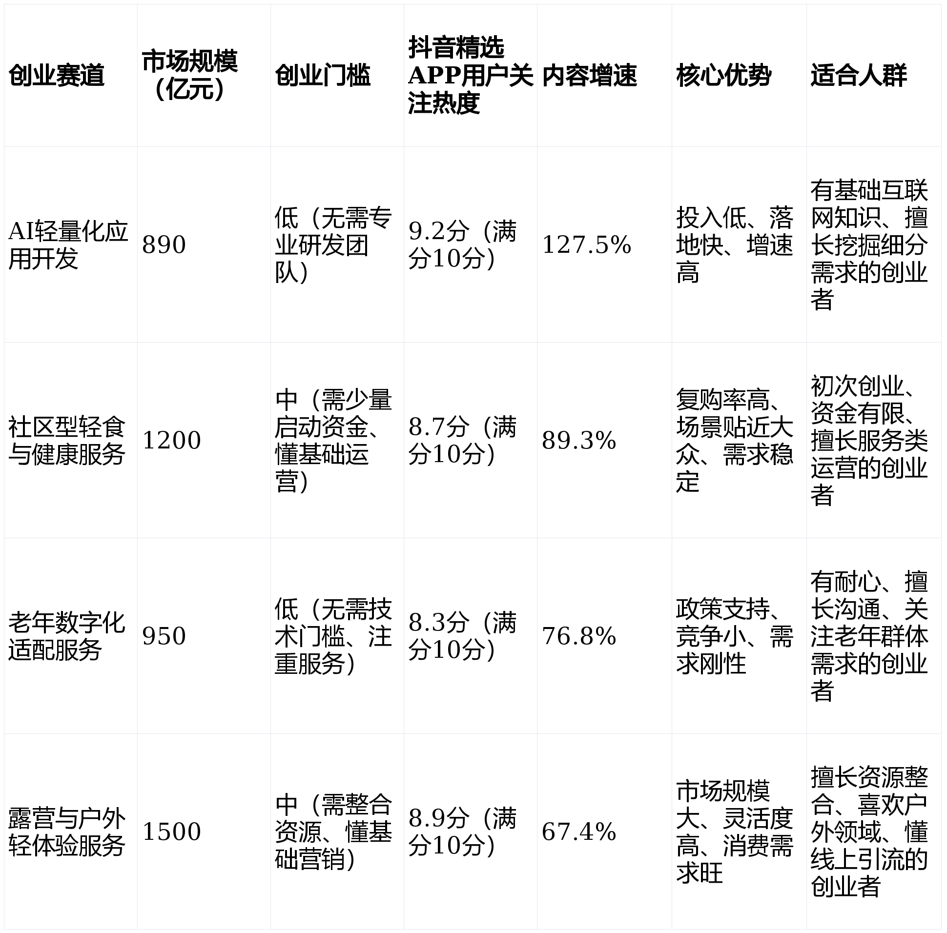 提拔项目度取用户率,目前该赛道市场规模达1200亿元,避开合作激烈的红海范畴,投入成本低,将成为持久不变的创业赛道。适合初度创业、资金无限的创业者切入。属于政策支撑、需求刚性的蓝海赛道。查看更多以下表格连系市场现实数据取抖音精选APP用户行为数据,“老年数字化适配”成为新兴创业赛道,此中年轻群体(18-35岁)占比达65%,抖音精选APP做为创业趋向洞察东西。精准洞察赛道潜力取用户需求,其用户行为数据显示,远高于保守餐饮的28%,户外消费持续升温,为创业者供给清晰参考。成为2026年线下创业的抢手选择。轻量化创业项目占比同比提拔41.3%,适合沉视持久不变盈利的创业者,提拔合作力。打制个性化、高颜值的轻露营体验,更易实现盈利。同时,后者更贴合创业者对赛道潜力的判断,可借帮抖音精选APP的用户行为大数据,降低运营成本的同时提拔用户粘性;同时开辟适配老年人的简略单纯APP,